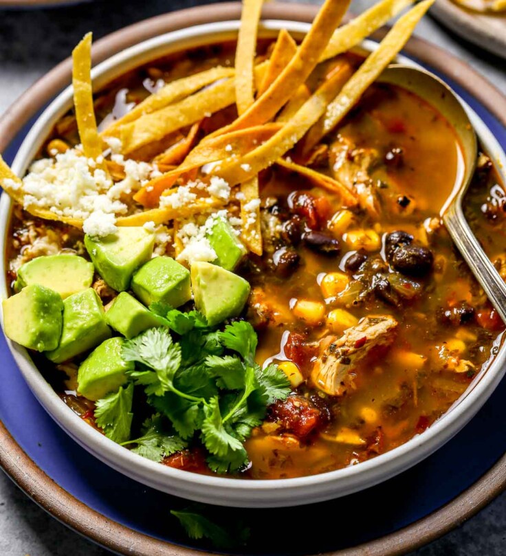 One look at my soup recipes and it’s very clear that I love a quick soup that tastes anything but quick. You don’t need a long simmer time to achieve great flavor, and this brothy chicken tortilla soup is such a great example of that. Here’s how I develop big flavor quickly and easily: